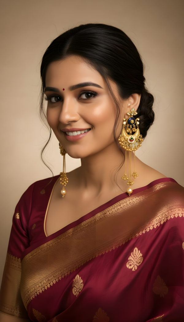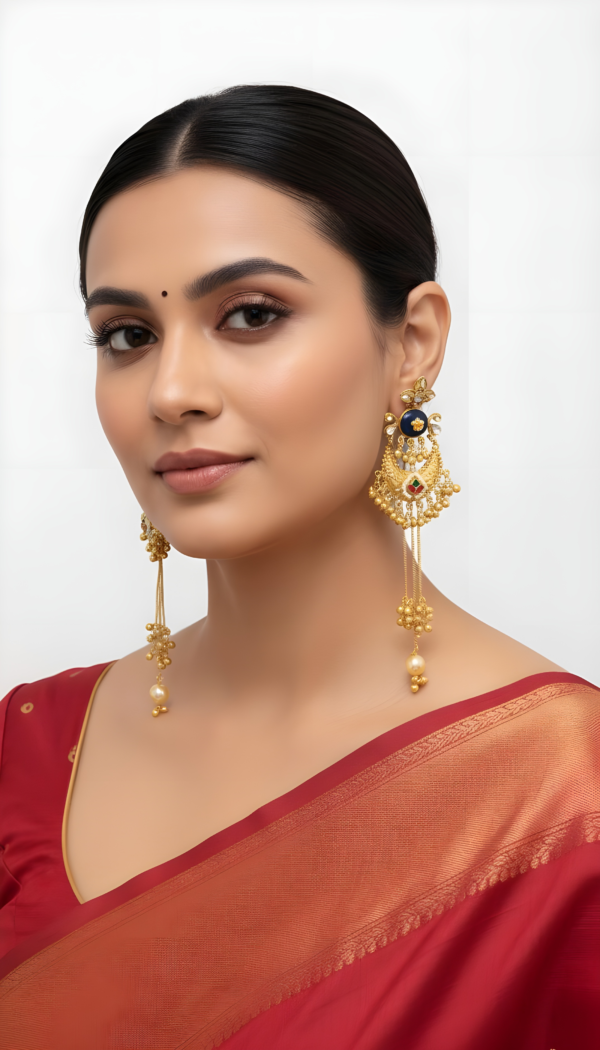 Handcrafted antique gold traditional earrings with detailed ethnic motifs and elegant pearl drop accents. Designed with a rich traditional finish, these statement earrings add timeless charm to festive and wedding looks. Lightweight, comfortable, and ideal for traditional occasions.