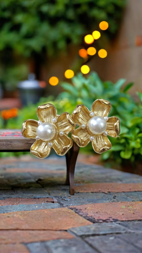 Handcrafted gold-tone floral stud earrings with a smooth pearl centerpiece. Designed with a minimal yet elegant finish, these earrings offer a refined traditional look while remaining lightweight and comfortable for all-day wear.
