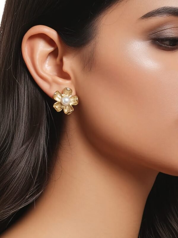 Elegant gold-tone floral stud earrings featuring a central pearl with delicate detailing. Lightweight, minimal, and perfect for daily wear, festive looks, and traditional outfits.