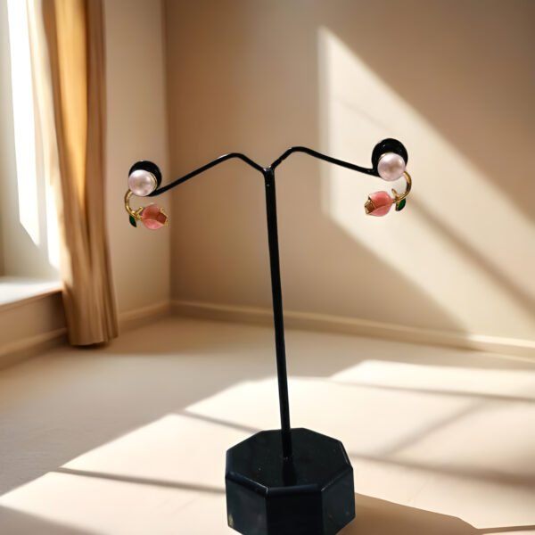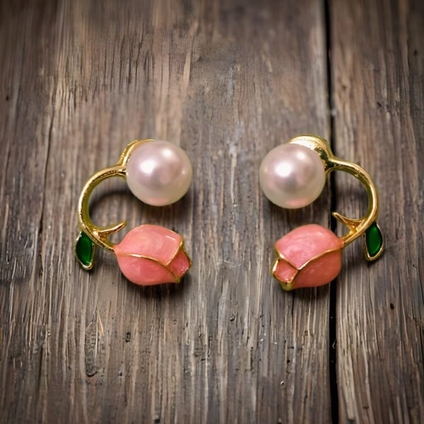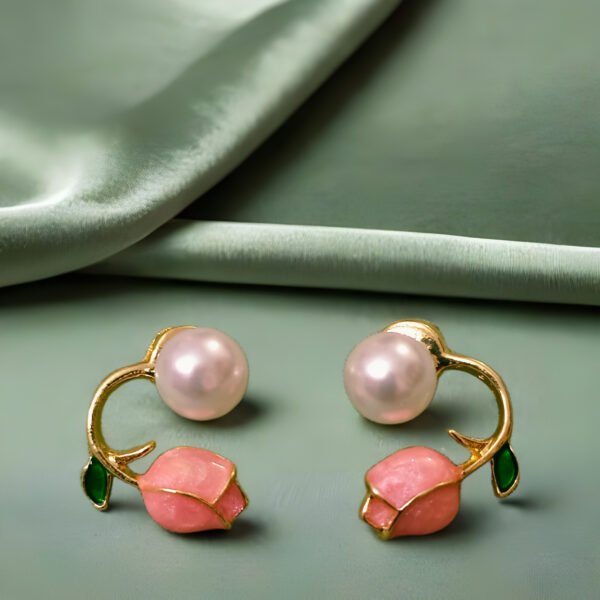 Elegant pearl stud earrings with a delicate rose bud design and premium gold-tone finish. Features soft pink detailing with a classic pearl accent for a refined, feminine look. Lightweight, comfortable, and ideal for daily wear, gifting, and subtle festive styling.