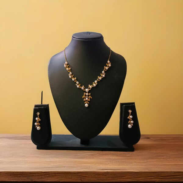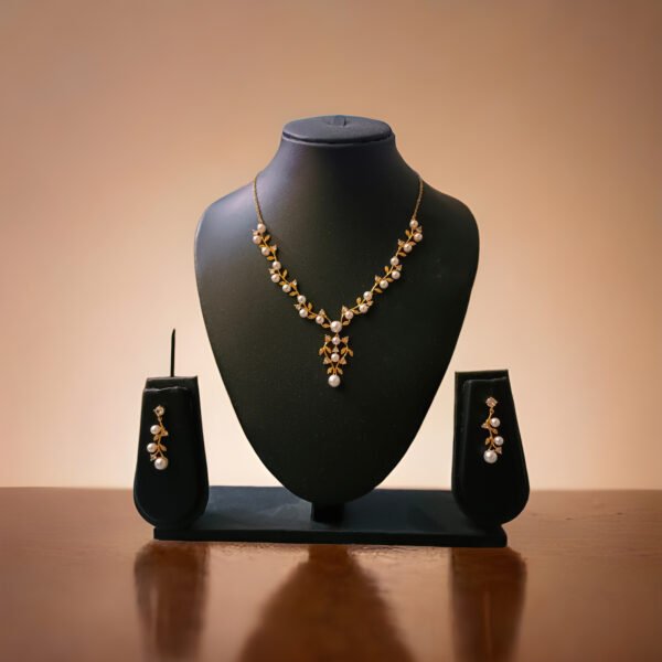 Elegant gold-tone necklace set featuring delicate pearl detailing with matching drop earrings, perfect for refined festive and occasion wear.