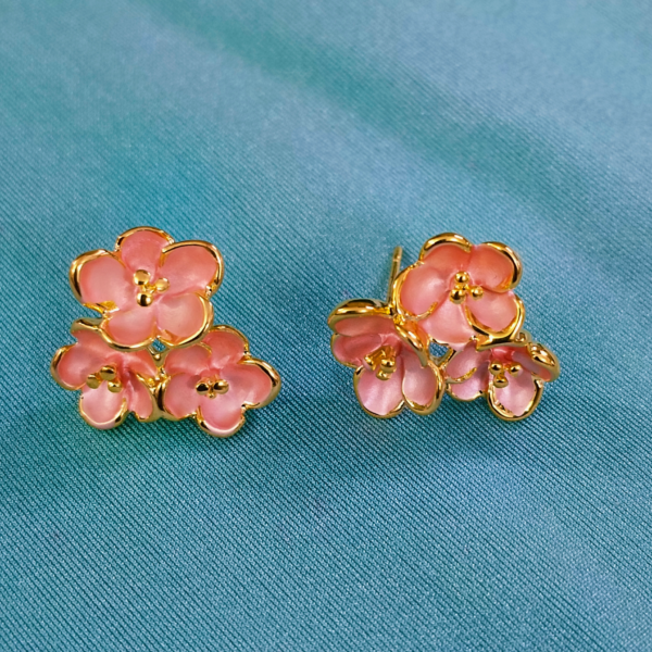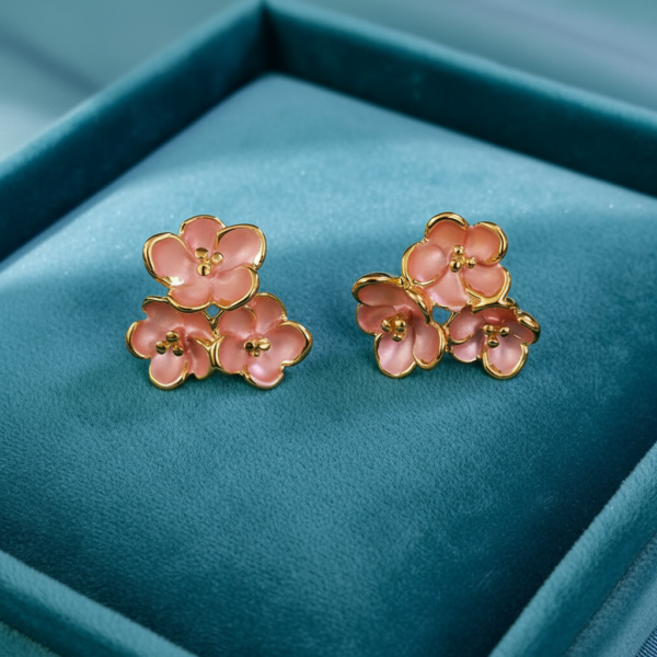 Handcrafted pink floral stud earrings featuring soft enamel petals with pearl accents and a refined gold-tone finish. Designed to be lightweight and comfortable, these earrings add a subtle charm to both casual and festive looks.