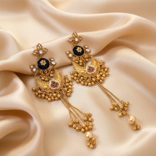 Handcrafted traditional gold-tone earrings featuring intricate detailing with classic motifs and elegant pearl drop accents. Designed to offer a rich ethnic look, these earrings are lightweight, comfortable, and perfect for festive, wedding, and traditional occasions.