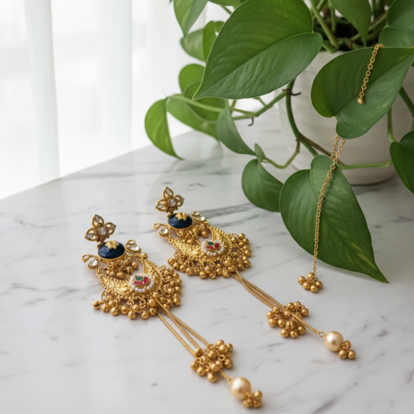 Handcrafted traditional earrings with a gold-tone finish, intricate motifs, and elegant pearl drop accents. Ideal for festive and ethnic wear.